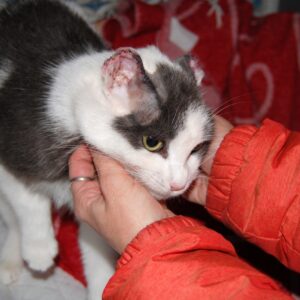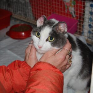 Pandina è una gattina di sei mesi, una randagetta che stazionava in via Wagner ad Anguillara. Durante l’intervento di sterilizzazione, i veterinari si sono accorti di un tumore alle orecchie e hanno provveduto ad arginarlo, tagliandole la parte estrema delle orecchie.